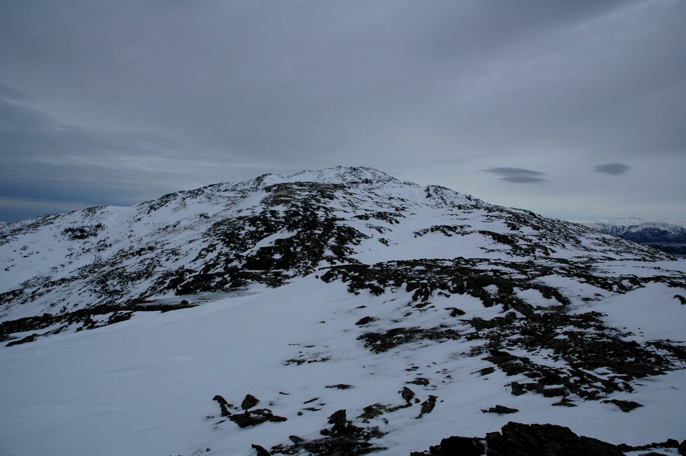 Det var godt å komme til varden. Sur vind drev over toppen og det var isende kaldt og det begynte å bli mørkt så vi kunne ikke bli lenge.. Utsikt vestover mot Vega og alle de kjente lokale fjellene sør for Brønnøysund.