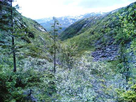 Terrenget bort over er noe myr. Stien er merket litt opp i terrenget i kartet, men vi går der vi finner det best til en hver tid. Vi ble overasket over hvor stort, åpent og idyllisk det var i dette dalføret. I tidligere tider har det vært flere gårder her inne, men nå er alt oppkjøpt av kraftlaget. Det er delvis tilplantet med granskog men også store åpne områder. Det går en kraftledning høyt oppe i dalen som er i bruk (tror den går fra Langfjorden via Børja og Laksmarka osv), mens det nede i dalen går noen gamle kraftledninger som ikke er i bruk.