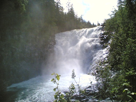 Nattens regn har gjort fossen enda større, og det frister ikke å vade denne elva høyere oppe. Terrenget her består av så mye stein og berg og lite jordsmonn så derfor vokser elvene utrolig raskt når det kommer mye regn.