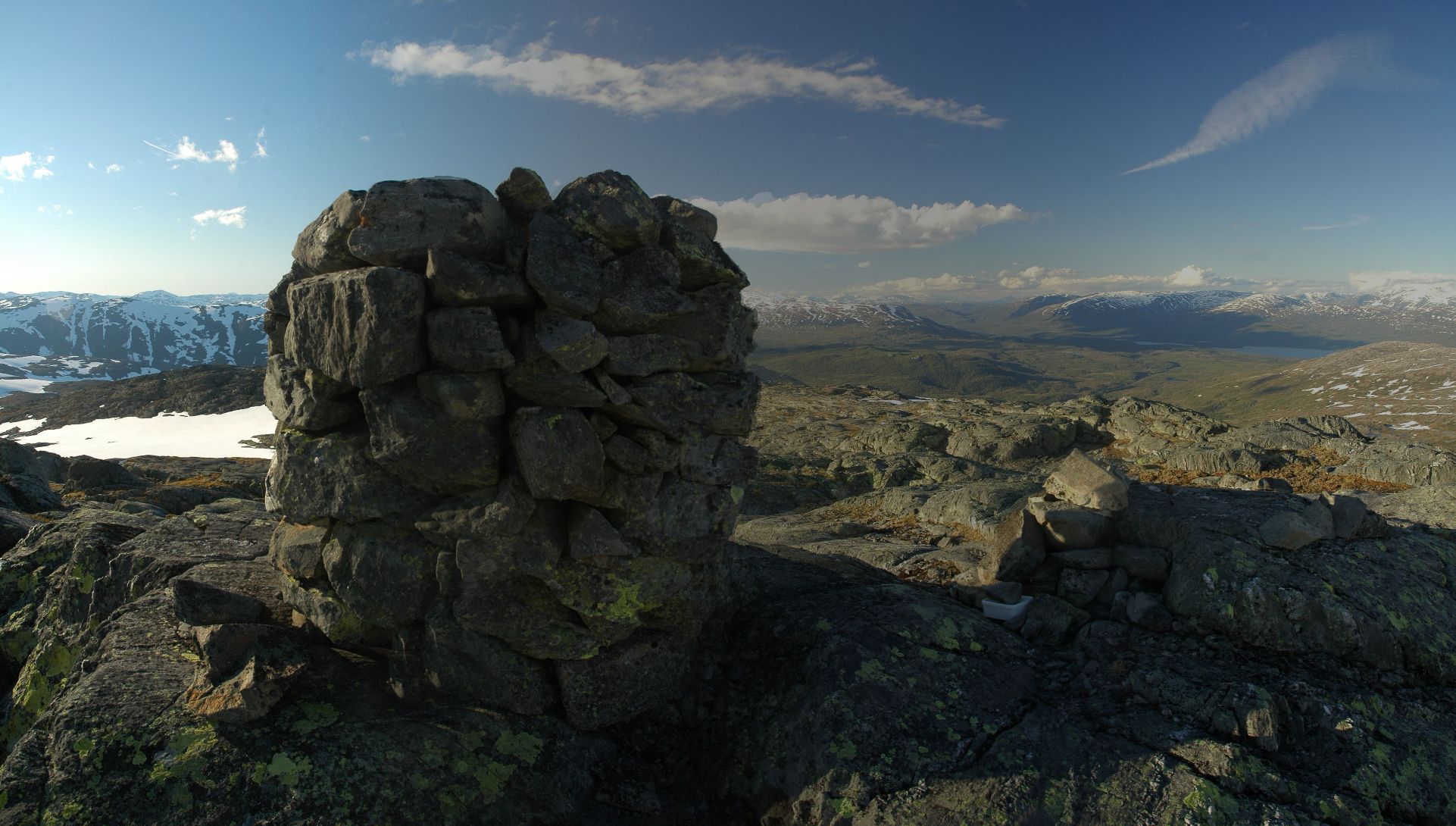 Etter en fin vandring oppover kommer jeg så mot toppen. Jeg er litt usikker hvor den er, og må ga litt tilbake over en snøfonn for å finne topp-punktet. Det er markert med en steinring med plastikk under. det har vel vært et merke her i forbindelse med oppmåling eller fotografering kan jeg tro.