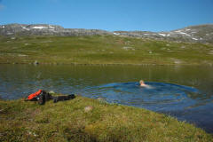 Vi finner oss en teltplass i øseregnet og tar tidlig kveld. Det passer meg svært godt at det er lite stigning. Jeg har blitt lat og feit i det siste. Lite trening og lite å trene opp i mot også - men slik er det bare. Formen skal bli bedre seinar :) |