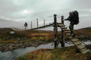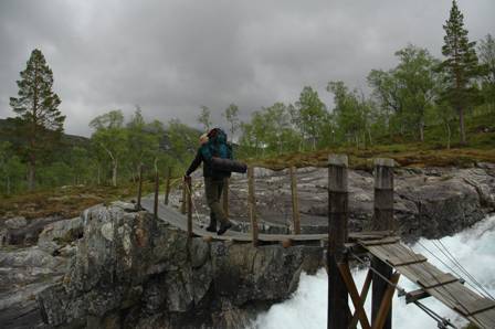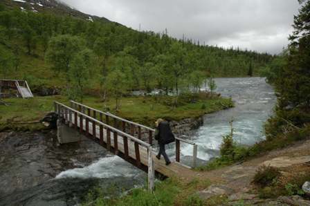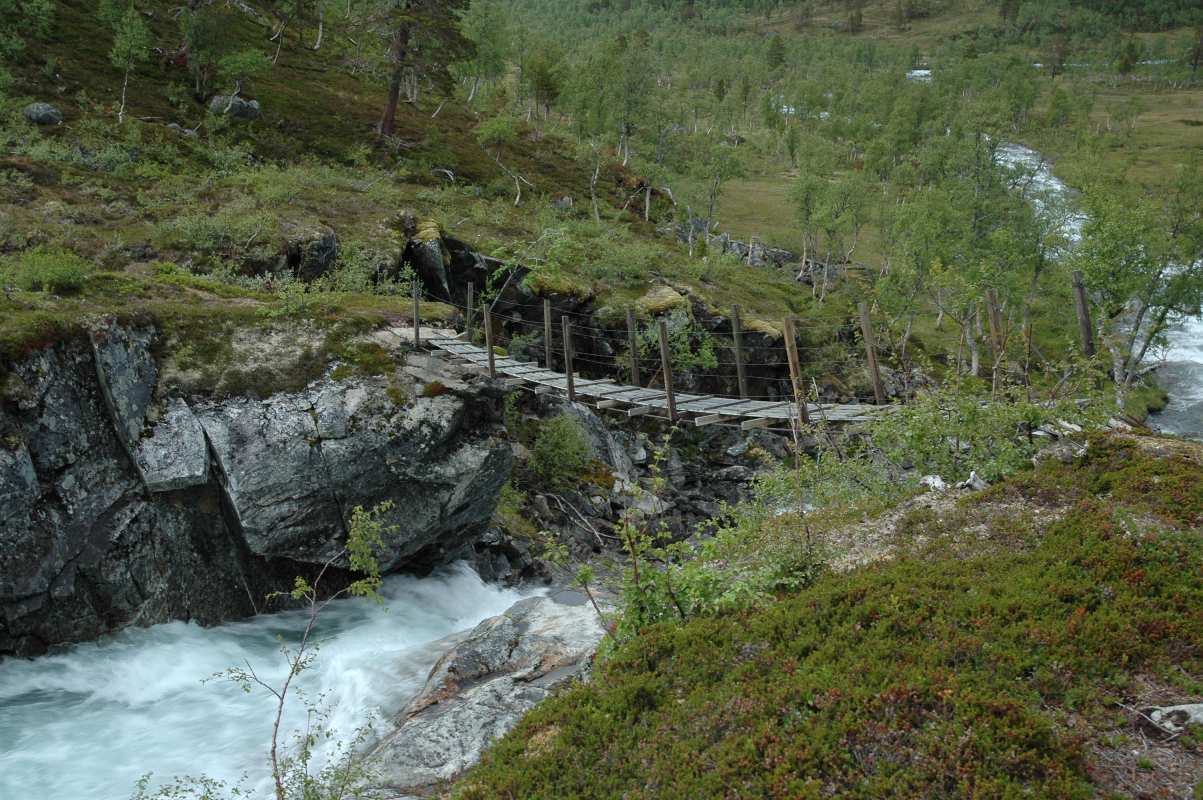 Her henger bergtrappen langt ut over og om det ikke hadde vært bro hadde det vært et lite hopp ned og bort. Vi slipper heldigvis det! Broa over Biseggelva.. tipper det er mange som har hoppet akkurat her før broen kom..