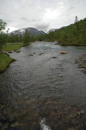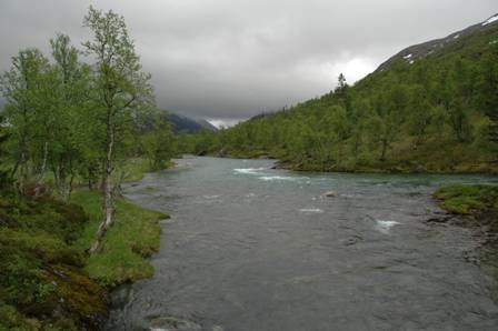 i Brønnøysund er Simskaret, som ligger ca 2 timers kjøring fra byen. Ja det været kan man ikke gjøre så mye med. I stedet for å sitte inne å vente på godvær, bestemte vi oss for å ta turen inn over land og se om det kunne bli en mulighet for å gå opp på Kvigtinden, eller i hvertfall ta en runde inn over Simskaret. Uansett innfallsport trenger man en dag bare på å komme seg inn i parken og helst bør man ha noen dager når man først tar turen opp dit. Vi hadde ikke det denne gangen. Vi kjørte hjemmefra på fredagen sånn i 18 tiden på ettermiddagen. Planen var å gå opp i Biseggskardet og telte der, og gjøre et forsøk på Dronningen av Børgefjell neste dag. Kvigtinden har vært et av mine turmål som har vinket i det fjerne, uten at jeg har rukket å gjøre noe med det. Men disse fjellene drar jo ingen plasser, så alt til sin tid. Ved ankomst Simskaret var det flere skilt som hang oppe med opplysninger om at broa over Golverskardelva var falt ned. Jeg var usikker på om broen over Rørskardelva var intakt, men det var bare ett å gjøre. Gå på sørsiden av Simskardelva.