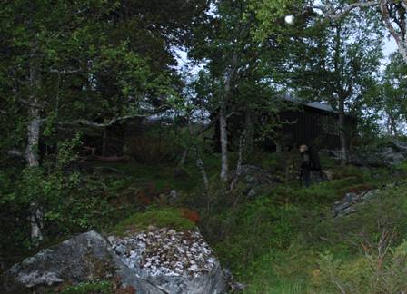 Vi snakker nå om å ta turen bort til Statsskog sin hytte i Simskaret. Om det ikke er folk der fra før så overnatter vi heller der enn i teltet. Vi kommer til hytten sånn i 22 tiden på kvelden, og finner det ganske så perfekt at det ikke er folk her. Det er sent og det begynner å regne.