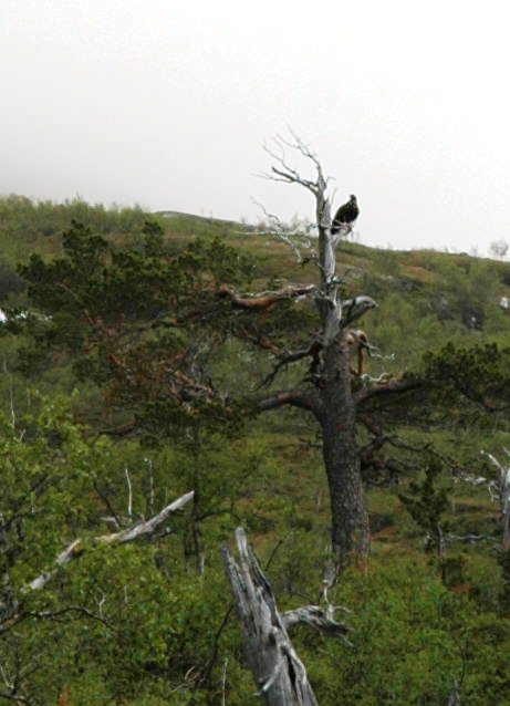 Et lite stykke fra hytten ser vi denne ørna som sitter i en grå furutopp. En stolt fugl i et flott landskap. Ikke lenge etter tar den til vingene.