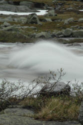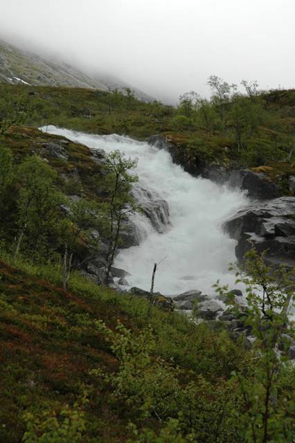 Det er full vinter enda her oppe på over 900 meters høyde. Skodden henger tett ned på fjellene og noen banker driver nesten ned mot oss. Vi ser at vi har et fantastisk landskap foran oss, en plass som vi skal tilbake til! Her i fra er det bare "flate" høyfjells-landskapet i flere dagsmarsjer i flere retninger. Ekte villmark uten rødmaling og hytter. Ved utløpet av Vestre Måsskardvann. Vi er ganske så snare her oppe, og går kjapt ned til våren og sommeren igjen! Elva er stor og vi forsøker å ta noen bilder av flomstor elv. Elva dundrer ned i gjennom dalen. Ikke