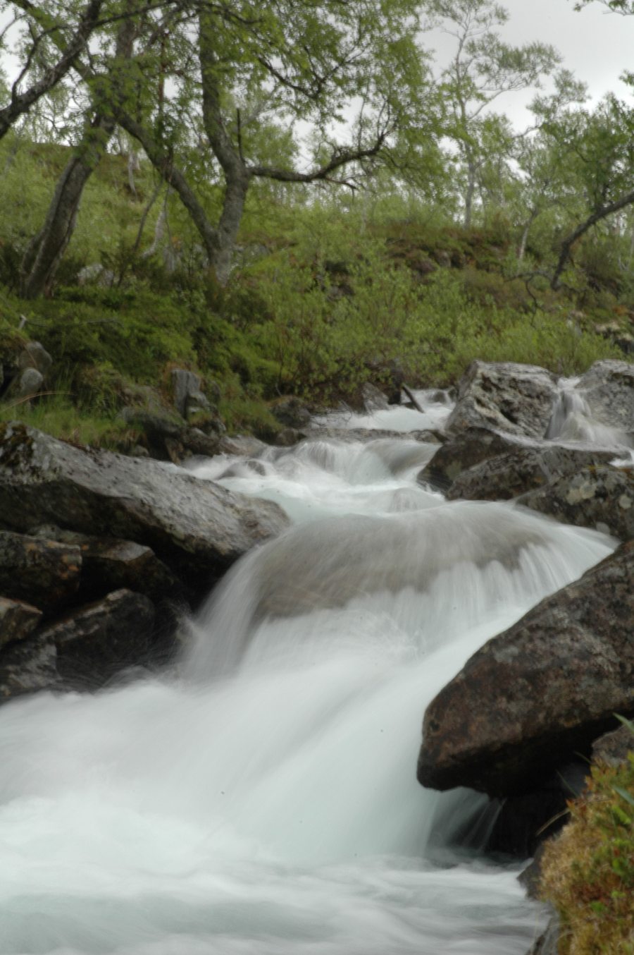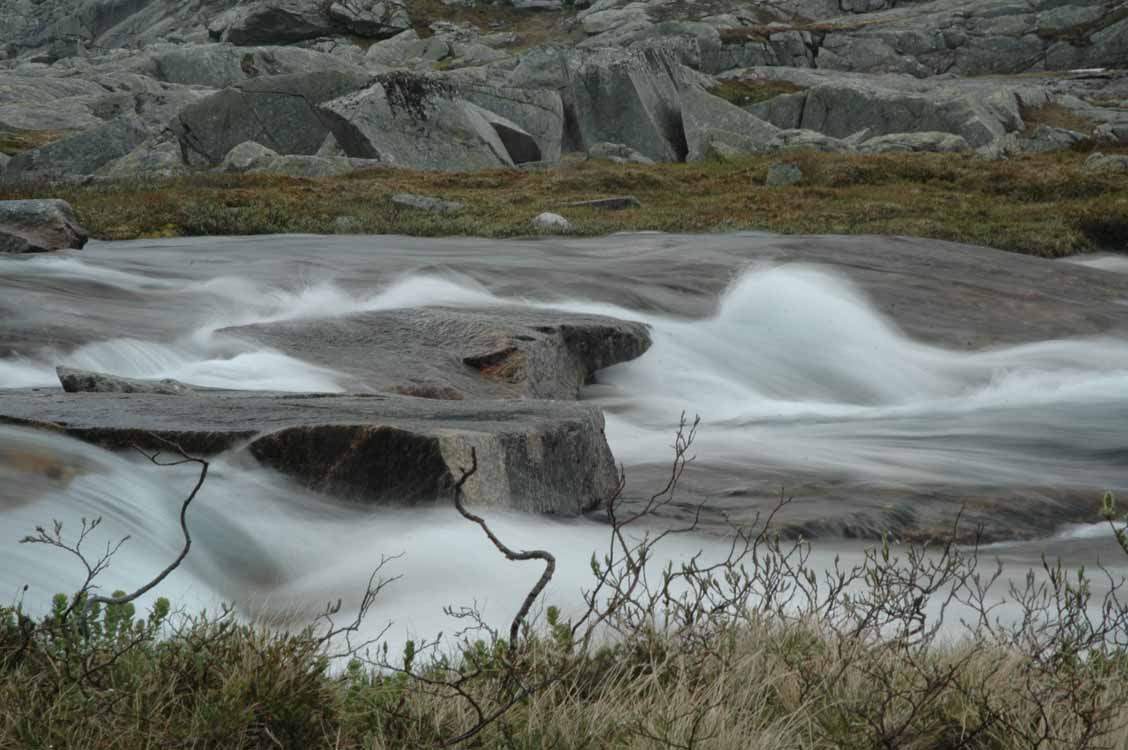 så lett å krysse disse elvene om man må det. Vi spiser litt og tar oss god tid ned i gjennom dalen. Rennende vann er det nok av, og vi prøver oss litt fram med å ta bilder av det.