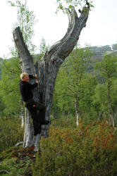 Vi holder god fart oppover og kommer etter hvert til en krokete bjørkeskog som nok strever med å overleve de store snømengdene som ligger her inne på vinteren.