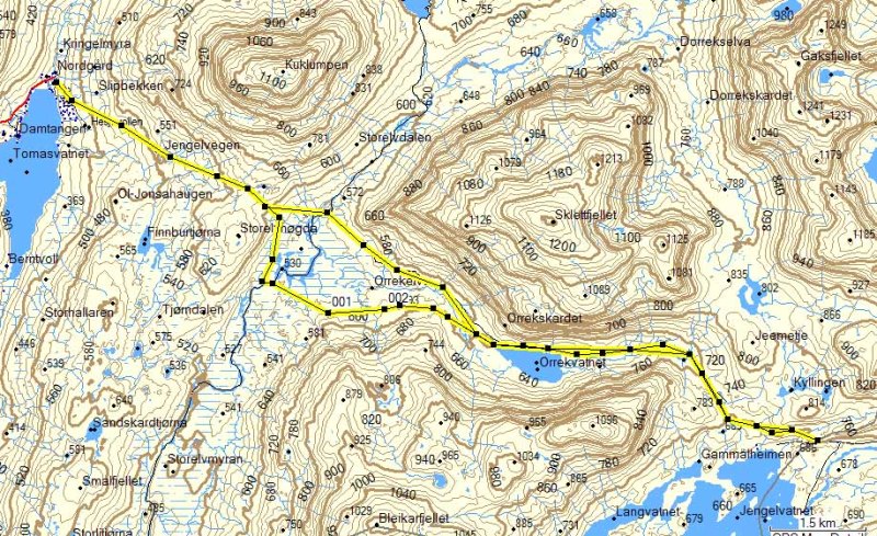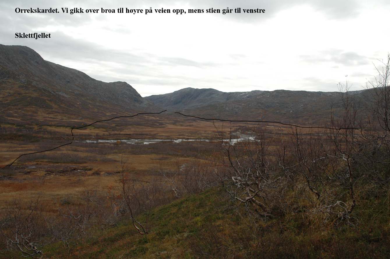 Terrenget er myrlendt i skardet mot Orrekvatnet. Jeg har nye fjellsko som jeg må gå inn, og disse er lave. Ikke noe godt valg i dette terrenget og med dette føret. Når klokken var 5 over 2 begynte det å regne som tidligere meldt av Storm. Vi var rimelig imponert over dette, og siden vi ikke var akkurat ved Jengelvatnet da, så var det mest sannsynlig regn her før vi fikk det. Vi så for øvrig store mengder med storørret på vår ferd! Ikke ofte ørreten svømmer i store stimer rundt bena dine, men det gjorde den altså her.