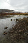 Vi er spente på hvordan Storelva er å krysse nå som det har regnet så mye. Vadestedet ser veldig gunstig ut, men det er umulig å krysse uten å bli våt. Jeg holder på å miste balansen midt uti elva, men klarte å ta meg inn igjen før jeg gikk helt i vannet. Ingen vits i å balansere på løse steiner her, og jeg kjenner bare hvordan det kalde vannet fyller skoene helt opp til over knærne. Godt å få skiftet ut det svarte myrvannet om ikke annet!