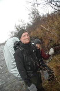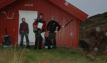 Ego med sydvesten, som trengtes denne dagen. Vi gikk over store områder og gjorde oss kjente med forholdene. Vi var ute helt til det ble mørkt, og det var da godt å komme til en varm hytte! Det regnet mer eller mindre hele dagen, og tåkeskyene hang faretruende lavt hele tiden.