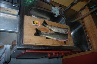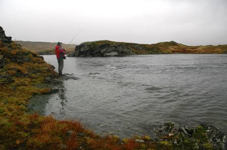 Turen hjemover ble en våt fornøyelse. Denne gangen fulgte vi stien, men her var det også svært oppgått, og de siste dagenes regnskyll gjør terrenget svært vått. Best som vi passerer en bekk på en halvmetersbredde, ser vi stor ørret som glir sakte opp i strømmen. Sindre peker mot en tue som ligger på min side av bekken, og da ser jeg også det samme som han. En stor sporde på størrelse med hånda mi, ligger i ro rett under vannflaten. Det er bare for meg å ta den med henda! Jeg tar av meg hansken og bøyer meg ned. Kjapt som lynet tar jeg hånda ned de få centrimetrene, men jeg er sjanseløs! Den stikker ned bekken i rasende fart. Hadde vi hatt en håv her kunne vi fanget så mange ørret vi bare ønsket.. Utrolig... 15 km i dette terrenget tar på lårene, men ikke på humøret. Vi går delvis i skodde, men traseen er lett å finne.