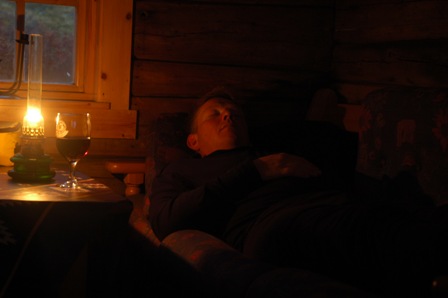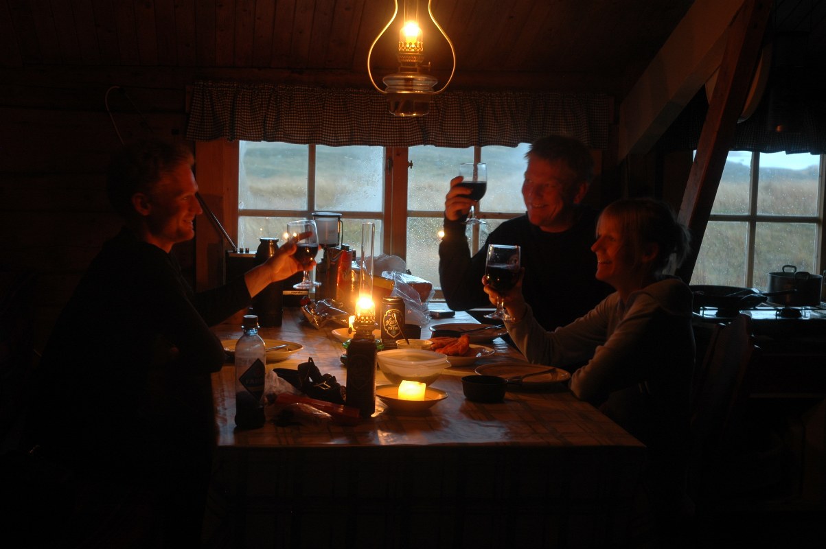 Vi ble svært overasket over den høye standarden på denne hytten. Langt ut i villmarken, og her mangler det ingenting. Svært praktisk, med parafinoppvarming, og soveplasser til 10 stykker. Det var reint og gjævt, og godt å henge opp klærne til tørk, og skifte til tørt! Den ytterste delen av hytta fungerer som nødbu og står åpen. På kvelden kokte vi pinnekjøtt til middag. Vi hadde med egen brenner for dette formålet, siden det var såpass lang koketid. Gjett om det smakte! Tipper det ikke er ofte det blir servert sånn julemat, med kålrabistappe her inne. :) Natten kom og de store nedbørsmengdene som var meldt, de kom til gangs! Det øste ned. I halv åtte tiden når Sindre skulle ut med børsa, var sikten så lav at han ikke kunne se utedoen, men da var det mest bare svartskodde.