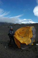 Da vi nærmet oss øya tok vi kontakt med basen på øya. De kunne fortelle at de hadde forsøkt seg på toppen et par dager tidligere og at de hadde måttet snu grunnet sprekker på ca 1700 meter. Basesjefen tok etter hvert kontakt med oss på VHF og fortalte at den plassen vi hadde tenkt å gå på land, ved Eggøya, hadde svært mye kvikksand. Han anbefalte at vi heller gikk mot Jamesonbukta. Vel - for å gjøre en lang historie kort - vi klarte å komme oss velberget på land uten noen store uhell. Vår første camp på øya ble en svært sandfull og støvfyllt en! Sand og støv drev forbi hele tiden. Tenk at man la en stasjon her på 20 tallet! Eldstemetten ligger ikke langt i fra der vi campet. Det hadde visst vært en sand og støvfyllt stasjon. Neste dag - Pål berger teltet sitt :)