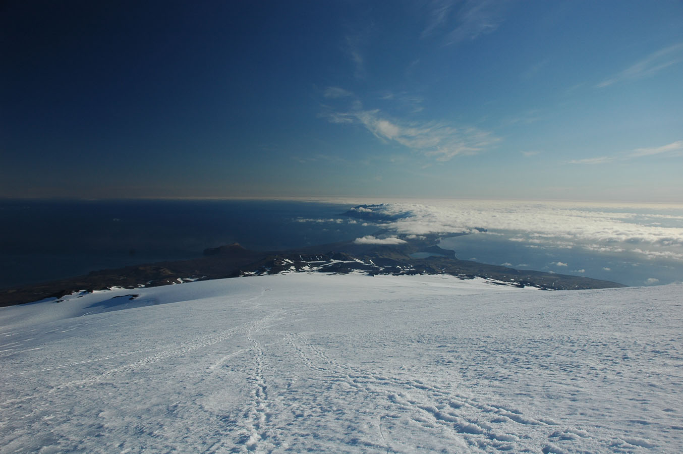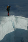 På vei ned igjen - bortover eggen. Nunataken og campen vår. Enorme dimensjoner.