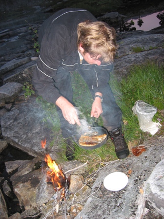Vi finner ura opp mot dalen noe tung å gå med storsekk. Tenk på dem som bodde her inne sier nå jeg. Som ikke bare dro på tur på en godværs dag. Vi finner ut at vi skal telte ved Lomsdaltjørnene, og slik blir det. Ved ankomst skal jeg overaske de andre karene med at jeg har bært med en boks pils inn til Lomsdal, men så kommer de opp med hver sin baks alle mann! Det var den overraskelsen... Alle lurte alle :) Så var det å steke noe fisk da. Bjørn hadde ordnet med melblanding så det skulle ikke vi ta med.
