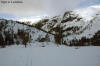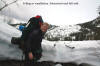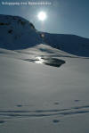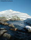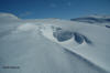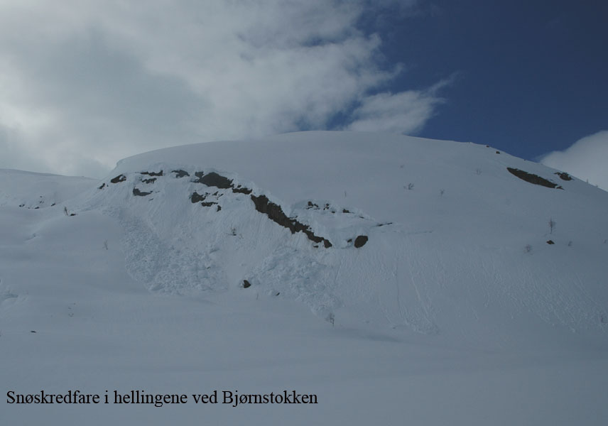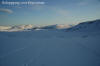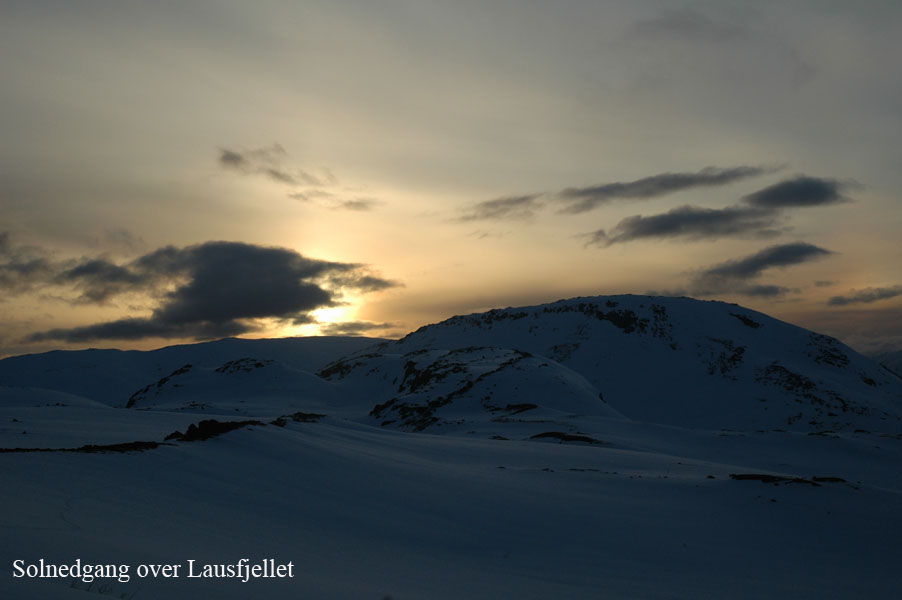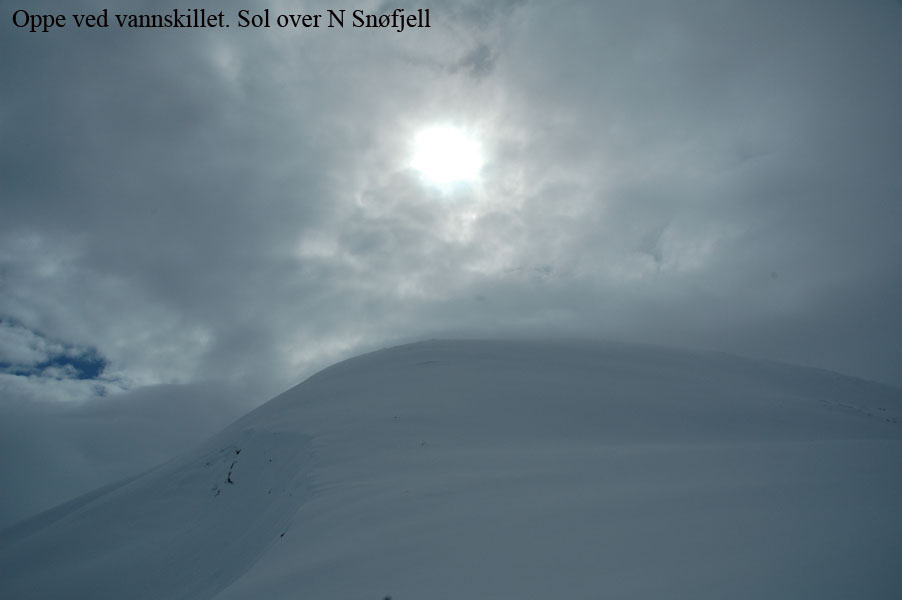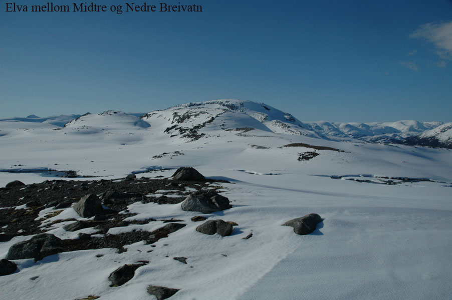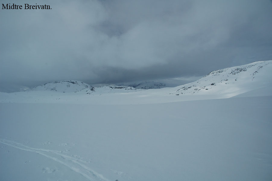 Da jeg kjørte inn over land ble det mer og mer regn, og da jeg kom til Borkamo øste det ned. Vel. Jeg så ingen annen råd enn å sette i gang. Siden jeg mistet de gamle fellene, var det i dag på tide og prøve de nye "Kneika" seilskinnsfellene. Jeg prøvde å tørke skiene så godt som mulig før jeg satte på fellene, men disse satt veldig godt på selv om det var fuktig. For sikkerhets skyld satte jeg på litt gråtape som sikring. Lia opp fra Borkamo var tung, og snøen var bare slaps. Sekken var også tung, og jeg bestemte meg der og da for å gjøre noe med teltsituasjonen min. Det er for stort for meg alene og veier hele 4,6 Kg. Da jeg kom opp til Bjørnstokken var det stadig ras både av stein og av snø. Det er mye snø, og ikke helt ufarlig når det er mildvær. Elva var ikke stor enda, så opptiningen har ikke startet for fullt enda. Fra Bjørnstokken og opp mot vannskillet var det overskyet og totalt "white-out". Når det da ble tåke i tillegg var sikten helt lik null, og det var ingen mulighet for å få tatt noen bilder. Jeg hadde nok med å finne rett og trygg rute. Jeg var glad da jeg var nede ved Midtre Breivatn, siden snøhengene både på Nordvestsiden og mot Sydøst var helt enorme. Fant allikevel en rute som kjentes trygg ut. Da jeg kom til ravinen, som ligger mellom Midtre og Nedre Breivatn ble jeg overasket over hvor lite snø det var videre ved Nedre Breivatn og mot Lomsdal. Det var tydelig at det hadde tint en god del på isen, og ut i fra den vurderingen jeg kunne gjøre fra denne høyden ville jeg ikke gå over isen her alene. Jeg tok da en kjapp avgjørelse om at videre ferd måtte vente og at jeg heller skulle satse på å sette opp en base og ta en tur på Lauvasstinden og Breivastinden neste dag. Valg av teltplass var enkel. Jeg satte opp teltet på ravinen der jeg sto. Tanken var å slippe høydemetre både når jeg skulle opp på fjellene neste dag, og ikke minst når jeg skulle tilbake med alt. |