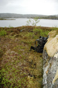 Jeg finner meg en fin teltplass her ved dette vannet. Regnet øser ned og jeg er våt til skinnet. Min Gore-tex jakke har nå tatt kvelden kjenner jeg. Har hatt den siden 2004, og den har vært med meg på utrolig mange turer, men nå er det slutt - tror jeg :) På kveldingen går jeg langs med vannet og prøver fiskelykken. Svært spennende kveld!