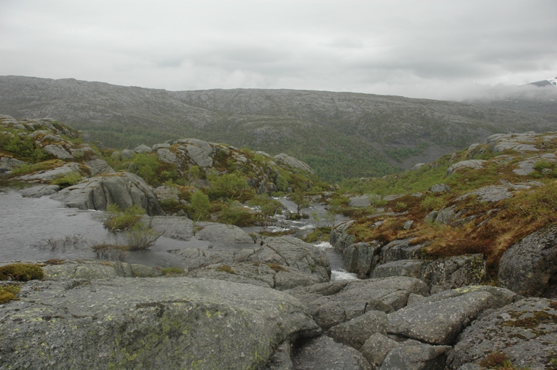 Jeg har tiden for meg og ikke noe spesielt fore, og jeg bestemmer meg for å ta turen via Botnvatnan - som drenerer ned mot Andalsvågen. Jeg har aldri vært her før, og ønsker å se området før kraftlinjen kommer. Turen går i ullskjorte og shorts - men det skyer til og begynner etter hvert å bli litt mer hustrig.