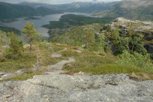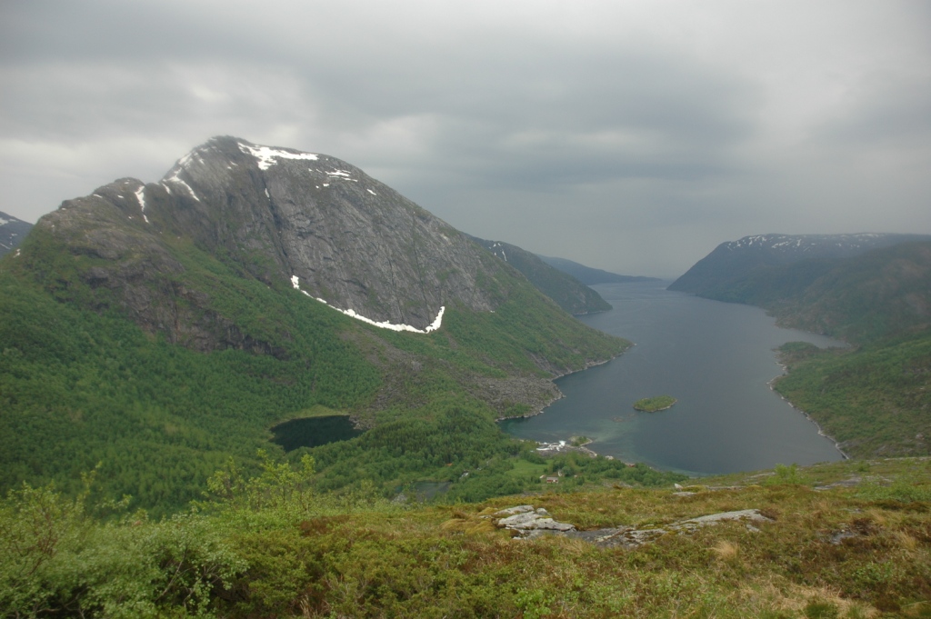 Storvatnet og Rundvatnet litt opp i fra fjellsiden. Campen er helt i venstre bildekant. Finnkneene og Vistenfjorden....