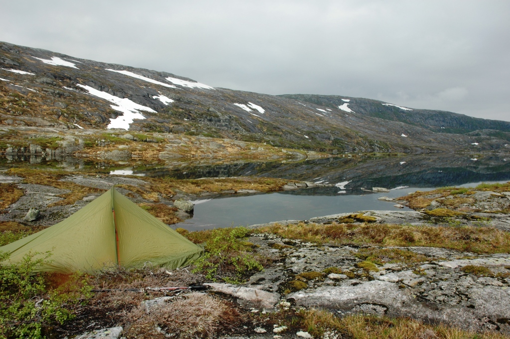 Jeg finner meg en stor stein med en flate i vannkanten på vestsiden av vannet og bestemmer meg for å telte her for natten. Det er opphold akkurat ved ankomsten så jeg er snar til å sette opp teltet.