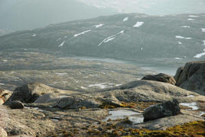 Varden er blåst litt i stykker og den kassen som boken ligger i ligger 5 meter fra varden. Det har tydeligvis vært heftige forhold oppå her i vinter! Jeg er første besøkende her i år også. Værvarslene for de neste dagene er ikke så gode så jeg vet å nye godværet når det er der. Jeg spiser meg en god middag oppå her og nyter været. Jeg er overasket over at det fortsatt ligger is på liåvatnet. Jeg har fundert å sjekke om det er fisk der en gang - har aldri hørt noe om det egentlig. Etter en 3 kvarter på toppen begynner jeg den lange nedstigningen mot Småvatnan. Jeg har løse planer for dagen, men har alltid hatt lysst til å se over mot Botnvatnan. Der har jeg aldri vært før.